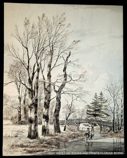 River landscape with trees with peasants in Winter 1830. original Drawing-Watercolor / paper, signed dated lower left, 44 x 35 cm, mit kleinem unterlegt. Randeinriss, with small tear at margin.