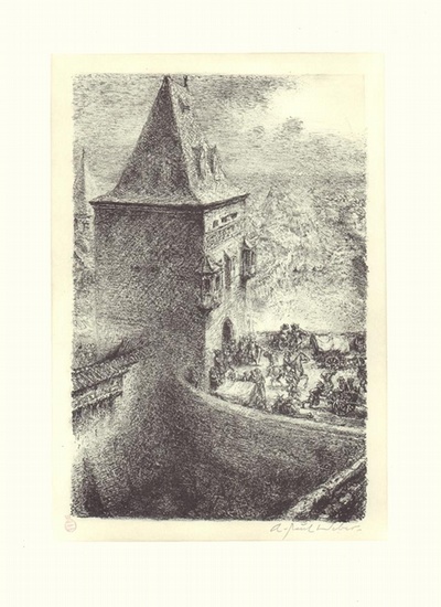 Grimmelshausen: Soest. Original-Lithographie (Nachlassblatt). 1985. 26,4 x 17,5 cm. Gerahmt. Dorsch Nr. 906. Im Stein signiert, m dem Stempel der Clan-Presse. Verso Nachlass-Stempel, signiert von Christian Weber. Auflage für den Weber-Kreis der Griffelkunst-Vereinigung Hamburg. Tor einer mittelalterlichen Stadt. Entstehung des Originals: 1969.