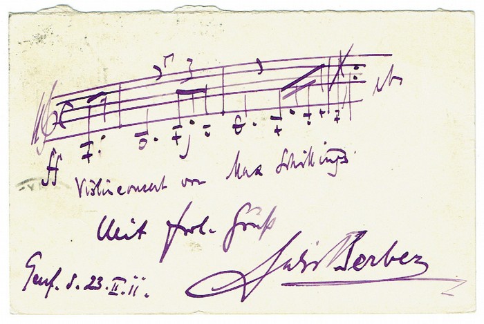 Eigenh. musikalisches Albumblatt mit Unterschrift auf der Rückseite einer Postkarte. Genf, 23. II. 1911. Quer-kl.-8vo. 1 p. Postgelaufen. Zitat aus ?Violineconcert von Max Schillings?.