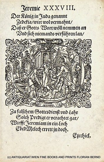 Jeremia 38 Jeremia in der Zisterne / Jeremiah 38 Jeremiah Thrown Into a Cistern 1571. original Holzschnitt von Jost Amman auf der ganzen Buchseite mit ornamentaler Umrahmung, Darstellung ca. 5,5 x 7 cm, verso weiss / original woodcut by Jost Amman on the whole book page with ornamental framing, image ca. 5,5 x 7 cm, verso blank. original Blatt aus Rebenstock: Neuwe Biblische Figuren etc. Feyerabend 1571 [VD16 R 436] vgl. Andresen: Der deutsche Peintre-Graveur I, 296, Jost Amman No. 182; 301, II.