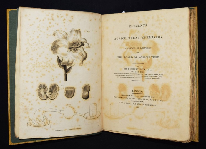 Elements of agricultural chemistry. In a course of lectures for the Board of Agriculture. London, Longman, Hurst, Rees, Orme, and Brown, 1813. 4°. VIII, 323, LXIII S., [2] Bl. mit 10 gestoch. Tafeln. Moderner Hldr. mit goldgepr. Rückentitel. Ferchl S. 116. Lexikon bedeutender Chemiker S. 109 f. Poggend. I, 528. - Gegenüber der ersten Ausgabe von 1795 wesentlich erweitert. - "During ten years, since 1802, I have had the honour, every Session, of delivering Courses of Lectures before the Board of Agriculture. I have endeavoured, at all times, to follow in them the progress of chemical discovery; they have therfore varied every year; and such is the rapidity with which Chemistry is extending, that some alterations and improvements were rendered necessary at the time they were preparing for the press" (H. Davy). - H. Davy (1778-1829), seit 1802 Professor der Chemie in London und 1820-1827 Präsident der Royal Society, entdeckte "bei der Elektrolyse geschmolzener Alkalien ... 1807 die Elemente Kalium und Natrium und gab ihnen die engl. Namen "potassium" und "sodium". Auf dem gleichen Wege gewann er als erster die Elemente Calcium, Magnesium, Barium und Strontium. In seinem Vortrag vor der Roy. Soc. trat D. 1810 den Nachweis an, daß Chlor keine Sauerstoffverb., sondern ein Element ist dem er auch erstmalig den Namen gab. Da auch im Chlorwasserstoff kein Sauerstoff nachgewiesen werden konnte, vertrat er den Standpunkt, daß nicht Sauerstoff, sondern Wasserstoff als charakterist. Bestandteil der Säuren anzusehen ist. Durch seine galvan. Versuche konnte er Erscheinungen erklären, die später als Ionenwanderung bezeichnet wurden. Bei der Elktrolyse von wäßrigen Salzlösungen beobachtete D. die Abscheidung von Wasserstoff und Metallen am negativen Pol und von Säuren am positiven Pol, woraus er auf eine elektr. ladung der Substanzen schloß, die zu einer Wanderung zum entgegengesetzt geladenen Pol führt. Damit gelang ihm eine Verknüpfung der Voltaschen Theorie mit der chem. Theorie. D. entdeckte das Chlordioxid, Phosphortri- und -pentachlorid sowie Phosphorwasserstoff, stellte 1811 Phosgen und 1812 phosphorige Säure dar und fand 1808 (unabhängig von Gay-Lussac) das Bor, das er aus Borsäure durch Reduktion mit Kalium und Wasserstoff gewann. 1813 berichtete D. vor der Roy. Soc. über eine neue Substanz, das Iod, das er von Clement erhalten hatte und das von Gay-Lussac zu einem früheren Zeitpunkt als Element erkannt worden war" (W. Müller in Lexikon bedeutender Chemiker). - Stellenweise etwas braunfleckig, sehr gutes breitrandiges und unbeschnittenes Exemplar.