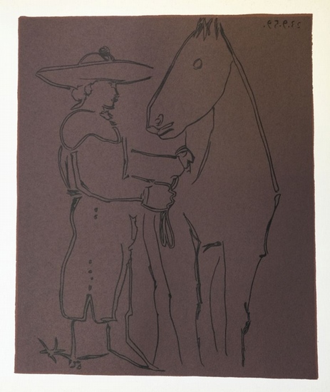 Picador und Pferd. Paris, Linolschnitt in braun und schwarz, 1962. 27x22,5 cm *Auflage 500 Exemplare.