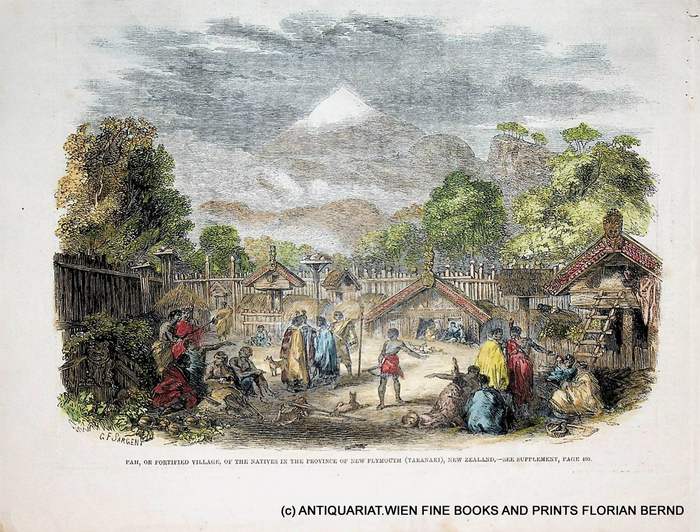 NEW ZEALAND, New Plymouth, Taranaki, M?ori people, view c.1860. original woodcut, handcolored, image size approx. 17,5 23 cm. old antique print picture, antique engraving, Verso text.