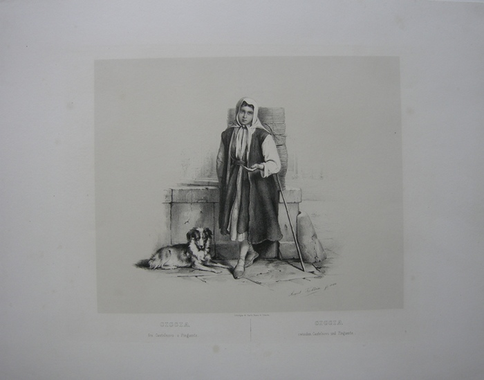 "Ciccia fra Castelnovo e Pinguete. Ciccia zwischen Castelnovo und Pinguente". Getönte Orig. Lithografie von August Tischbein (1809-1855). 28 x 34 cm. Blattgröße 43 x 55,5 cm, rechts unten im Stein signiert und datiert. _. Bettelndes Mädchen mit Hund. Aus: August Tischbein, August Selb "Erinnerungen einer malerischen Reise in dem österreichischen Küstenlande. Memorie di un Viaggio pittorico nel litorale austriaca", gedruckt bei B. Linassi, Triest, 1842. - schönes Exemplar.