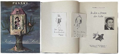 In den Armen der Liebe. Stuttgart, Hamburg: Deutscher Bücherbund (Lizenz Rowohlt). 1963. Mit zahlr. schw.-w. Zeichnungen. Unpag. Gr.-Oktav. gutes Exemplar. mit 2 kleinen signierten Zeichnungen von Raymond Peynet (1 montiert auf Vorsatz, 1 lose beiliegend).