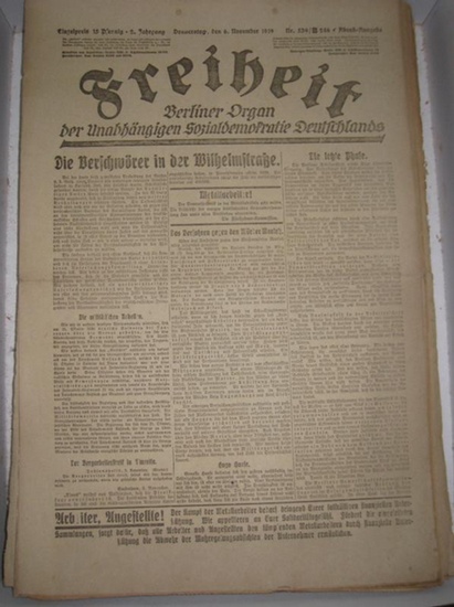 Die Freiheit. 2. Jahrgang 1919. Berliner Organ der Unabhängigen Sozialdemokratischen Partei Deutschlands. Konvolut mit 135 Nummern, beginnend mit Nr. 45 vom 26.01.1919 bis Nummer 539 vom 06.11.1919. Dabei die Nummern 260 - 359 und 419 bis 456 ziemlich komplett. Berlin 1919. Folio (46 : 32 cm). Papierbedingt in den Rändern etwas gebräunt, dort auch empfindlich für Ausbrüche. Mittig zwar mit schwacher Knickspur, aber ungefaltet gelagert. Je Nummer 2 bis 6 Blätter. Zumeist mit Heftungsspuren im seitlichen Rand. Sonst sauber und gut erhalten. Erschien vom 15.11.1918 bis 30.9.1922, teils zweimal täglich. Kue00001.