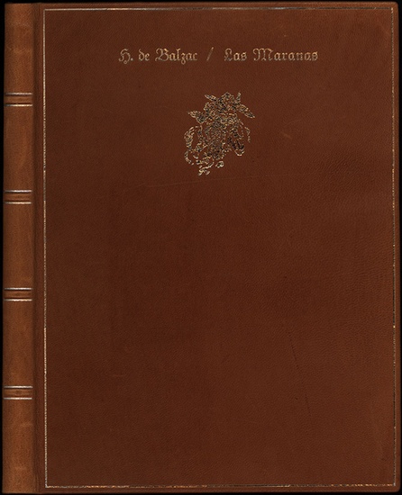 Las Maranas. Eine Novelle. [Signierte Vorzugsausgabe]. München, Verlag der Münchner Drucke, 1923. 4°. 27,5 x 21,5 cm. 99 Seiten. Original-Lederband mit goldgeprägtem Deckeltitel, goldgeprägter Deckelillustration, goldgeprägten Rücken- und Deckelfileten und rauem Schnitt. (= Münchner Druck, Band 3). Nummer 3 der 10 in Leder gebundenen Vorzugsausgaben (Gesamtauflage 200 Exemplare). Rodenberg 3. Von Werner Schmidt im Kolphon in Blei signiert. Mit lithografiertem Titelblatt und zahlreichen weiteren lithografierten Abbildungen im Text von Werner Schmidt. Ins Deutsche übersetzt von Lucy von Jacobi. Einband minimal berieben, Rücken kaum merklich aufgehellt. Sehr gutes, dekoratives Exemplar.