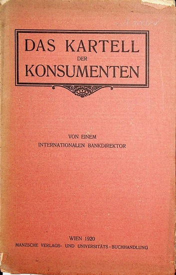 Das Kartell der Konsumenten. von einem internationalen Bankdirektor Wien, Manz Verlag, 1920. original Broschur, gr.-8?, IV, 76 S.Einband etwas berieben.