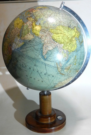 Columbus Erdglobus in 12 Segmenten und zwei Polkappen. Modell 100, Presseglobus. Politisch-physisch Maßstab 1 : 35 000 000. Bearbeitet von H. Fischer. Glaskugel mit 12 kolorierten Papiersegmenten, Halbmeridianring aus verchromten Messing. Holzfuß in Mahagonioptik mit eingearbeitetem Kompaß Durchmesser etwa 37 cm, Höhe ca. 59 cm. Berlin - Lichterfelde: Columbusverlag Paul Oestergaard [1939]. [Ein paar kleine Flecken, sonst, zumal für das Alter, überraschend gutes Exemplar]. Seltener Globus aus der Zeit des Nationalsozialismus. Die Datierung ergibt sich aus dem Kartenbild, Österreich ist "angeschlossen", Tschechien und Polen existieren noch. Der Presseglobus galt seinerzeit als Luxusedition und wurde zum doppelten Preis der vergleichbaren Standardausgabe mti 33 cm Durchmesser angeboten. - Vgl. Lehmann 83 und 96. --- Attention please: Customers outside the EU please note that due to the weight shipping will be significantly more expensive than displayed.