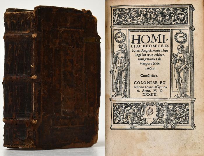 Homiliae Venerabilis Bedae Presbyteri Anglosaxonis, theologi suo aeuo celeberrimi, hyemales & quadragesimales de tempore ac sanctis. Nunc primum summa diligentia restitutae & in lucem aeditae. 2 Bände [in 1, komplett]. Köln, Verlag Johann Gymnich, 1534. Klein-8°. 17 x 11,5 cm. [8] Blatt, 351 Seiten; 403 Seiten, [4] Blatt. Lederband der Zeit über Holzdeckeln auf 3 echten Bünden mit reicher Blindprägung. Erstausgabe. Ausgabe in Latein. Wendland 184. Panzer IV, 429, 746. Das erste Titelblatt mit Holzschnittdruckermarke (Seepferd und Zepter, darauf ein Kranich mit einer Schlange im Schnabel) und das zweite Titelblatt mit Holzschnittbordüre (Adam und Eva), jeweils gefertigt von Anton Woensam von Worms. Mit eingedruckten Marginalien. Erster Druck dieser Predigtensammlung des angelsächsischen Benediktinermönches Beda (ca. 672 - 735). Einband mit kleinen Wurmlöchern, rissig und mit Fehlstellen im Lederbezug und in den Holzdeckeln selbst (unter anderem Ecken herausgebrochen) sowie Überresten unfachmännisch entfernter Schließen, je im Innenfalz gelockert, hinterer Vorsatz mit privat montiertem Papierschild (Titelaufnahme aus einem Auktionskatalog), etwa die ersten und letzten 80 Blatt mit einzelnen stecknadelkopfgroßen Wurmlöchern (teilweise minimaler Textverlust einzelner Buchstaben), Paginierung gelegentlich springend, Papier gebräunt und fast durchweg wasserrandig (etwas nachgebräunt, nicht gewellt, an einzelnen Stellen bis über die Hälfte in die Seite hineinreichend, ansonsten zumeist in den Stegen ohne Textberührung), stellenweise blass stockfleckig, vereinzelt Seiten mit Unterstreichungen und Wappenschild des zweiten Titelblatts mit kleiner Zeichnung von alter Hand in Tinte. Leather binding of the times on wooden boards with 3 raised bands and rich blind embossing. First edition. Edition in Latin. Wendland 184, Panzer IV, 429, 746. First title page with woodcut printer's mark (seahorse and sceptre, with a crane with a snake in its beak) and second title page with woodcut border (Adam and Eve), both made by Anton Woensam of Worms. With imprinted marginalia. First printing of this collection of sermons by the Anglo-Saxon Benedictine monk Beda (ca. 672 - 735). Binding with small wormholes, fissured and with defects to the leather cover and the wooden boards themselves (amongst others corners missing) as well as remnants of unprofessionally removed clasps, rear endpaper with privately mounted paper label (from an auction catalogue), approximately the first and last 80 sheets with single pinhead-sized wormholes (some causing minimal text loss of individual letters), pagination with occasional errors, paper darkened and almost throughout with tidemark (a bit darkened, not wavy, in few cases reaching over halfway into the page, otherwise mostly affecting the margins without touching the text), some pages with pale foxing, few pages with underlining in ink by an old hand.