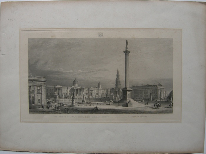 The Nelson Column, W. Railton, Esqr F.G.S. Architect, with the improvements of Trafalgar Square. _. Blick über den Trafalgar Square mit der Nelson-Säule im Vordergrund, links die Nationalgalerie, zwei Brunnen auf dem Platz, einige Figuren im Vordergrund. Orig. Radierung von Thomas Higham nach George Belton Moore, 1842. 26 x 45,5 cm Blattgröße 42,5 x 59 cm. - Crace 1878. A Catalogue of Maps, Plans and Views of London, Westminster and Southwark, collected and arranged by Frederick Crace (XI.142). - gut erhaltenes breitrandiges Exemplar.
