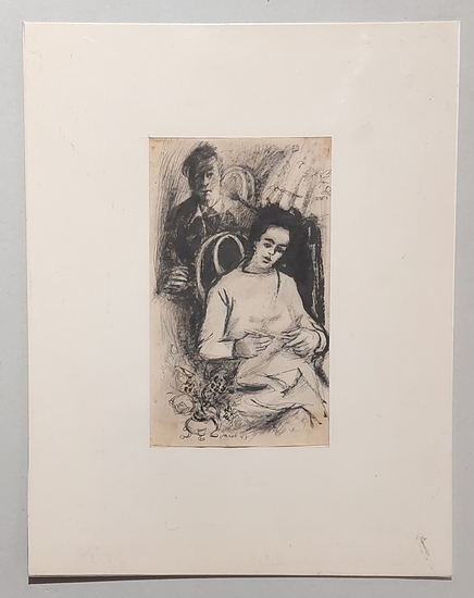 Original-Tuschzeichnung. Sitzende häkelnde Frau, dahinter ihr Mann. Handschriftlich signiert und datiert. 1943. 21x13 cm. Ecken etwas fleckig und gebräunt. Auf Unterlage montiert. Klebespuren.