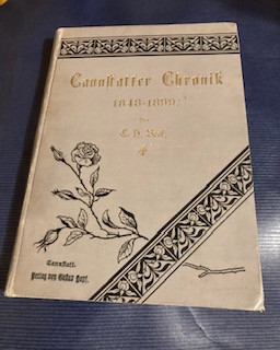 Cannstatter Chronik über die zweite Hälfte des XIX. Jahrhunderts. Nach Urkunden, Aufzeichnungen u. Erinnerungen zsgest. von C. H. Beck. (In 14 Lfgn.). Cannstatt, G. Hopf / Stehn'sche Buchhandlung, 1900. (362 Seiten. Mit mehreren Ansichten und zwei gefalteten Plänen. Illustriertes goldgeprägtes Original Leinen. Die Versandkosten für Kunstwerke und mehrbändige Werke können von den Standard-Versandkosten abweichen. Gut erhalten.