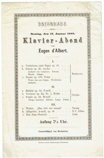 Programm ohne eigenh. Zusatz. ohne Ort, 16. I. 1888. 8vo. 1 p. Leichte Knickspuren und gebräunt. Rückseitig leicht geklebt. Auf dem Programm des Konzertes im Unionhaus standen Werke von Beethoven, Chopin, Tausig, Alkan und Liszt. - Aus der Autographensammlung des spanischen Pianisten Antonio Baciero (geb. 1936).