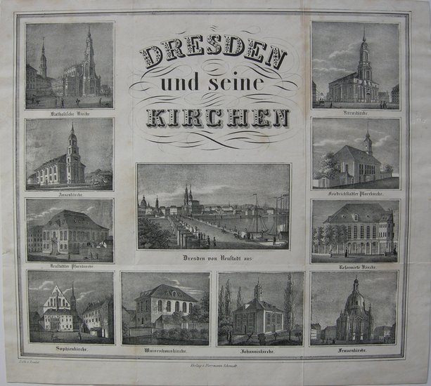 "Dresden und seine Kirchen". _. Sammelblatt mit Dresdens Kirchen, im Zentrum Dresden von Neustadt aus mit der Augustusbrücke, und Randansichten der Katholischen Kirche, Annenkirche, Neustädter Pfarrkirche, Reformirte Kirche und Frauenkirche. Lithografie von Riedel, im Verlag v Herrmann Schmidt, um 1840. 35 x 40 cm. - geglättete Falze, rechts oben Bräungsstreifen, drei winzige Löchlein.
