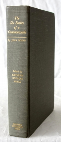 The Six Books of a Commonweale. A Facsimie reprint of the English translation of 1606. Corrected and supplemented in the light of a new comparison with the French and Latin texts. Edited with an Introduction by Kenneth Douglas McRae. Cambridge/Mass., Harvard University Press, 1962. 4to. (A:) XII, 2 Bll., 103 S. (Introduction and Appendices), (B:) Tb. (Ausgabe 1606), X, 794 S., (A:) (103-) 214 S. (Notes and Index). Originaler Verlagsleinen mit Rückentitelprägung. Neuwertiger Zustand! Mit gedruckter Widmung "To Carl J. Friedrich". - Neben der Ausgabe der "Six Bookes of a Commonweale" von 1606, die Richard Knolles aufgrund französischer und lateinischer Ausgaben kongenial ins Englische übertragen hatte ("In the preparation of the present edition Knolles's text has been subjected to a thorough comparison, line by line, and sometimes even word by word, with the French and Latin versions..."), vor allem interessant durch die zahlreichen Zusätze McRaes, u. a. einer Diskussion der verschiedenen französischen und lateinischen Versionen des Meisterwerks (A28 ff.) oder eines umfassenden Anmerkungsapparats (A105 ff.).