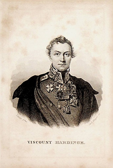 HARDINGE, Henry Hardinge, 1st Viscount Hardinge (1785-1856), British army field marshal, Governor-General of India c. 1847. original steel engraving by Carl Mayer, c. 10,5 x 7 cm / original Stahlstich. Portrait, kein Buch, antike Grafik verso: weiss, Portrait, no book, antique graphic verso: white.
