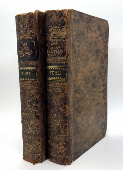 Das Leben und die Meynungen des Herrn Tristram Shandy. Aus dem Englischen übersetzt. Berlin/Stralsund, Gottlieb August Langen 1769-1771. (ab Teil III: Berlin, Gottlieb August Langen). (Teil IX: Berlin/Stralsund, Gottlieb August Langen 1767). Zweyte Auflage nach einer neuen Übersetzung. 9 Teile in 2 Bänden. Kl.-8°. Mit 2 gest. Frontispices, einer gest. Titelvignette, einer Holzschnittillustration u. einigen Holzschnittvignetten./with 2 frontis. and 1 woodcut-ill. Marm. Ldr. mit Rückengoldprägung und je 2 goldgepr. Rückenschildern./contemp. calf, gilt-stamped Einbände berieben, stellenweise leicht stockfleckig, sonst nur leicht gebräunt und gut erhalten. Vorsätze, flieg. Vorsatzblätter und erste (Zwischen-) Titelblätter jeweils mit alten Nummern bzw. Besitzvermerken. Rosenberg/Hollein (Hrsg.). Turner, Hugo, Moreau. Entdeckung der Abstraktion. S. 285f.; KLL 13, 5708 - Zweite Ausgabe der ersten deutschen Übersetzung von Laurence Sternes (1713-1768) "The life and opinions of Tristram Shandy, Gentleman", die ab 1761, auf Veranlassung des Verlegers Gottlieb August Langen, erschienen ist. Sprachlich wie auch druckgraphisch steht die vorliegende Ausgabe allerdings hinter der bekannteren, 1774 in Hamburg publizierten Übersetzung von Johann Joachim Christoph Bode. Sterne rezipiert auch die Linientheorie ("line of beauty") William Hogarths (1697-1764), indem er im Teil VI plötzlich 5 "leidlich gerade Linien" einfügt. "Sterne, der sich des Witzes seiner unerwarteten Vorgehensweise bewusst ist, demonstriert, dass nicht nur Figuren und Bewegungen, sondern auch Romane auf Linien reduziert werden können." (Entdeckung der Abstraktion, S. 276). Die beiden Frontispize stammen von dem deutschen Kupferstecher Christian Benjamin Glassbach (1724-1779). Das Zwischentitelblatt und das Indexblatt von Teil II wurden fälschlicherweise zu Beginn des zweiten Bandes eingebunden. Der neunte und letzte Teil wird im vorliegenden Exemplar als "Zweyte Auflage" bezeichnet, es dürfte sich allerdings um die Fassung der Erstausgabe handeln. Second edition of the first German translation of Laurence Sterne's (1713-1768) "The life and opinions of Tristram Shandy, Gentleman", which was published from 1761 onwards at the instigation of the publisher Gottlieb August Langen. In terms of language and printing, however, this edition is inferior to the better-known translation by Johann Joachim Christoph Bode, published in Hamburg in 1774. Sterne also draws on William Hogarth's (1697-1764) "line of beauty" theory by suddenly inserting 5 "reasonably straight lines" in Part VI. "Sterne, who is aware of the humour of his unexpected approach, demonstrates that not only figures and movements, but also novels can be reduced to lines." (Entdeckung der Abstraktion, p. 276). The two frontispieces are by the German engraver Christian Benjamin Glassbach (1724-1779). The title page and the index page of Part II were erroneously bound in at the beginning of the second volume. The ninth and last part is labelled "Zweyte Auflage" in the present copy, but it is probably the version of the first edition.