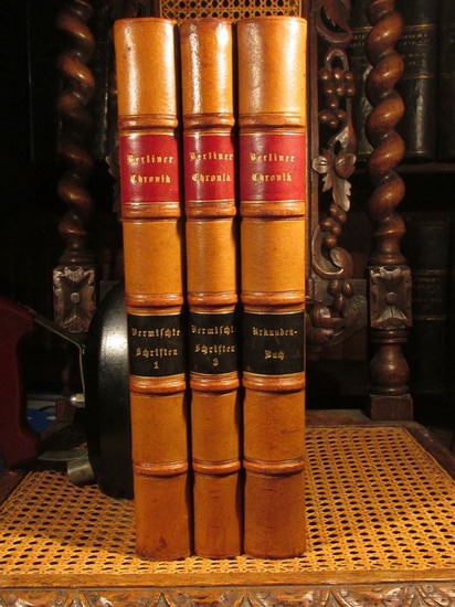 Berlinische Chronik / Urkunden-Buch zur Berlinischen Chronik / Vermische Schriften im Anschluß an die Berlinische Chronik und an das Urkundenbuch I und II, 4 Bände (in 3 Bänden), Halbleder-Ausgabe. Berlin, Verlag der Königlichen Geheimen Ober-Hofbuchdruckerei, 1868 - 1888. Vollständiges Werk in 4 Bänden (gebunden in 3 Bänden). Braune Halblederbände der Zeit im Folio-Format 36 x 26 cm auf 5 Zierbünden mit goldgeprägten Rückentiteln auf rotem und schwarzem Rückenschild sowie mit dreiseitigem Rotschnitt; Buchdeckel mit grünen Leinenbezügen und großen Lederecken; ferner mit mehrfarbig illustrierten Vorsätzen. Großformatiges, reich illustriertes Werk zur berlinischen Geschichte, zur Genealogie traditionsreicher Berliner Familien, zur Biographie namhafter Berliner sowie zur Denkmalpflege, Baugeschichte. Die Bände enthalten zahlreiche, teils mehrfach ausfaltbare und sehr großformatige Bildtafeln.Das Gesamtwerk umfaßt vier Bände, die in drei Bänden gebunden sind. Bd. I: Berlinische Chronik. Hrsg. von dem Verein für die Geschichte Berlins von F. Fidicin (1868; 242 S., 1 Bl.); Vermische Schriften im Anschluß an die Berlinische Chronik und an das Urkundenbuch. Erster Band (1888): A. Berliner Geschlechter. B. Namhafte Berliner. C. Berliner Denkmäler (ohne fortlaufende Paginierung). Bd. II: Vermische Schriften im Anschluß an die Berlinische Chronik und an das Urkundenbuch. Zweiter Band (1888): A. Berlinische Bauwerke. B. Berliner Medaillen. C. Berliner Siegel. D. Kunstbeilagen (ohne fortlaufende Paginierung). Bd. III: Urkunden-Buch zur Berlinischen Chronik. Hrsg. von dem Verein für die Geschichte Berlins von F. Voigt (2 Bl., 514, XVI S.). Enthalten sind 436 Urkunden-Abdrucke. Erste Abtheilung: Die Zeit der Askanier von 1232 bis 1323. Zweite Abtheilung: Die Zeit der baaierischen Fürsten von 1324 bis 1373. Dritte Abtheilung: Die Zeit der luxemburgischen Fürsten von 1374 bis 1411. Fünfte Abtheilung: Von 1411 bis 1550. Mit untergliedertem Register im Anhang: I. Orts-Register. II/I: Geistliche Fürsten. II/II. Weltliche Fürsten. III. Sachregister. Die Großbände in sehr gutem Zustand, kaum berieben oder bestoßen, im Leder noch frisch wirkend; lediglich die Deckelbezüge - vor allem beim Vorderdeckel des Bandes II - stellenweise mit Farbabrieben. Von dieser optischen Beeinträchtigung abgesehen, tadelloses Exemplar dieser großformatigen Prachtausgabe des facettenreichen, reich illustrierten Werkes zur Berlinischen Geschichte. Weitere Fotos auf der Homepage des Antiquariats (bitte Art.-Nr. auf der Angebotsseite in das Suchfeld eingeben).