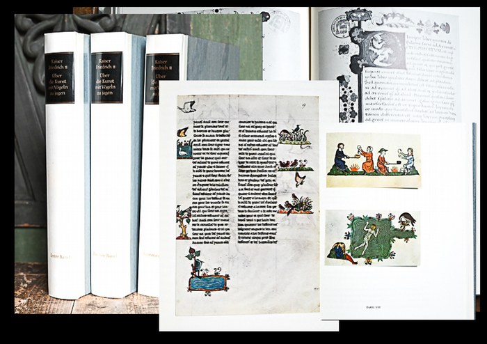 Über die Kunst, mit Vögeln zu jagen. Übertragen und herausgegeben von Carl Arnold Willemsen. 2 Bände und Kommentar in 3 Bänden. Frankfurt, Insel, 1964-, 1970. circa 28,3 x 19,5 cm., Zusammen mehr als 1000 Seiten mit vielen Tafeln und montierten Farbabbildungen. Original-Halbpergament in Schubern Sarkowski 497. - Deutsche Übersetzung mit dem später erschienenen Kommentarband, eines von 900 Exemplaren. - Gut erhalten, sauber - alle 3 Bände.