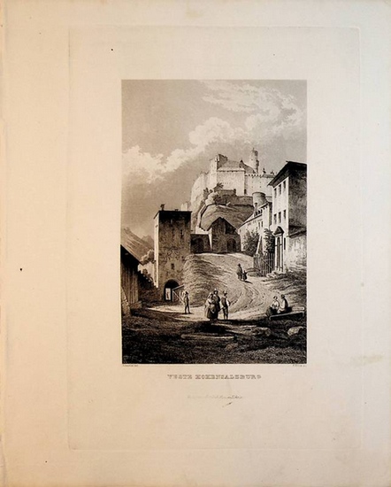 SALZBURG, Festung Hohensalzburg [Prag], Haase, [1846]. Ansicht, original Stahlstich von E. H?fer nach J. Grueber, Bild c. 15 x 10 cm. Antike Druckgrafik, Verso weiss, antique print, verso white.