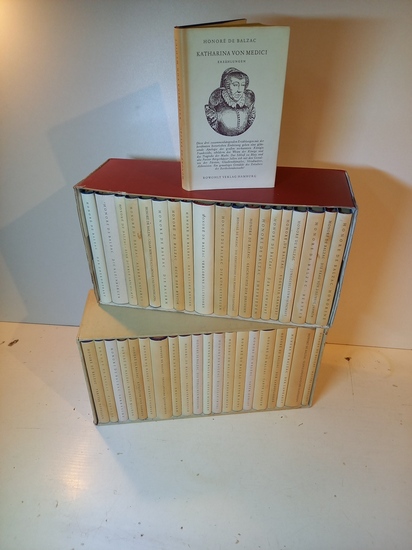 Gesammelte Werke. (Comédie Humaine). 40 Bände [komplett]. Hamburg, Rowohlt, 1951. Dünndruck- zus. ca. 17000 S. Kl.-8°. Flexibles blaues Orig.-Leinen mit Rückenvergoldung u. goldgeprägtem roten Rückenschildchen mit illustriertem Orig.-Umschlag. Nachkriegsausgabe. Nach dem Krieg erschien eine Neuausgabe, inklusive des nur in der Nachkriegs-Ausgabe erschienenen Bandes "Maitre Cornelius" (dieser seltene Band ist hier vorhanden !) - 1.albert savarus, 2. beatrix, 3. buch der mystik, 4. cäsar birotteaus grösse und niedergang, 5. der alchimist, 6. der ehekontrakt, 7. der landarzt, 8. der landpfarrer, 9. die bauern, 10. die frau von dreissig jahren; 11. die geheimnisse der fürstin cadignan, 12. die kleinbürger, 13. die königstreuen, 14. die lilie im tal, 15. die tödlichen wünsche, 16. ehefrieden, 17. eine dunkle geschichte, 18. eugenie grandet, 19. geschichte der dreizehn, 20. glanz und elend der kurtisanen, 21. heimliche könige, 22. honorine, 23. junggesellenwirtschaft, 24. katharina von medici, 25. künstler und narren, 26. maitre cornelius, der verstossene sohn, 27.modeste mignon, 28. nebenbuhler, 29. oberst chabert, 30. pariser novellen, 31. pierrette, 32. sarrasine, 33. tante lisbeth, 34."trollatische geschichten, 35."ursula mirouet, 36. vater goriot. 37. verlorene illusionen, 38."vetter pons, 39. volksvertreter, 40. zwei frauen. Teilweise mit doppelten Schutzumschlag versehen, sonst gute Exemplare.