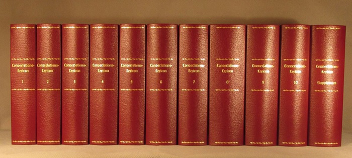 Brockhaus: Conversations-Lexicon oder encyclopädisches Handwörterbuch für gebildete Stände, 10 Bände + Supplement-Band. 2./3. Auflage, Halbleder-Ausgabe (1814 - 1819). Leipzig (und Altenburg), F. A. Brockhaus, 1814 - 1819. Dritte, ganz umgearbeitete Auflage in 10 Bänden. Grundwerk in 10 Bänden sowie der 1818 erschienene Supplement-Band für die erste, zweite und dritte Auflage, insgesamt somit 11 Bände. Die Bände 1 bis 5 als Bände der dritten Auflage (wobei Bd. 5 mit dem Pendant der zweiten Auflage bereits identisch ist), die Bände 5 bis 10 als Bände der zweiten Auflage (auch so gekennzeichnet); gleichwohl, aufgrund der besonderen Bandarithmetik, reguläres und vollständiges Exemplar der dritten Auflage. Die sehr sauberen Buchblöcke wurden den nicht mehr so ansehnlichen Ursprungsbänden entnommen und von unserer Buchbinderin Silke Menzel (paperbookart) neu eingebunden (nachdem wir mehr als ein Jahr lang über die Einbandgestaltung diskutiert hatten); die Original-Marmorpapiere der Ursprungsbände wurden aus diesen herausgelöst und fanden in den neuen Bänden noch wieder Verwendung. Entstanden sind nunmehr bordeauxrote Halblederbände mit goldgeprägten Rückentiteln, Bandnummern, grazilen floralen Ornamentbändern und Lederecken; Deckelbezüge aus mehrfarbigen, farblich auf die Buchrücken abgestimmten Handmarmorpapieren (Dirk Lange); dreiseitiger Grünschnitt. Die Einbandgestaltung ist historischen Vorbildern nachempfunden, ohne diese zu imitieren. Auf übertriebene Ornamentik, die hier eher kontraproduktiv gewesen wäre, wurde verzichtet. Die Vorgänger-Auflage, also die zweite Brockhaus-Auflage, erschien 1809 zunächst in 6 Bänden und 2 Supplement-Bänden. Es folgte von 1812 bis 1819 eine zweite, gründlich überarbeitete Ausgabe dieser Auflage, nunmehr in zehn Bänden, die überwiegend von Friedrich Arnold Brockhaus (1772 - 1823) selbst besorgt wurde. Das so zustande gekommene zehnbändige Werk gilt heute als die eigentliche Keimzelle des modernen Brockhaus-Lexikons sowie des Konversationslexikons mit universeller, enzyklopädischer Ausrichtung überhaupt. Die im erweiterten Titel genannten Wissensgebiete lassen das breite thematische Spektrum des Werkes erkennen. Der Druck erfolgte vom 5. Band an in der Altenburger Druckerei des Brockhaus-Freundes und späteren -Konkurrenten Heinrich August Pierer (1794 - 1850). Die hier angebotene dritte Auflage schließt sich unmittelbar an die überarbeitete Version der zweiten Auflage an und ist in den Bänden 5 bis 10 mit dieser identisch, so daß die dritte Auflage als Neuauflage an sich nur aus den Bänden 1 bis 4 besteht. Alle 10 Bände enthalten ein Artikelregister im Anhang. Überschattet wurde das Erscheinen der Auflage durch den unautorisierten Nachdruck des Werkes durch den württembergischen Verleger Karl Eberhard mit seiner Firma A. F. Macklot, gegen den sich Brockhaus in Ermangelung einer einschlägigen Urheberrechtsgesetzgebung kaum wirksam zur Wehr setzen konnte. Am 16. Januar 1817 schlossen Brockhaus und Macklot schließlich einen Vergleich, der es Eberhard gestattetet, seine bisher gedruckten Exemplare ungehindert abzusetzen, ihn aber gleichzeitig verpflichtete, Brockhaus eine Entschädigung zu zahlen und keine weiteren Exemplare des Werkes herzustellen. Die Kontroverse hat im Brockhaus-Lexikon selbst ihren Niederschlag gefunden: Bd. 10 enthält im Anhang eine ausführliche Abhandlung über den Verlegerstreit. Das Buchinnere steht den neuen Einbänden kaum nach: Die Seiten sind sauber, nahezu fleckenfrei und kaum gebräunt. Die ursprünglichen Bände wurden augenscheinlich kaum oder gar nicht benutzt. In toto sehr schönes, ästhetisch ausgewogenes Exemplar dieser sehr seltenen frühen Auflage des Brockhaus-Lexikons.