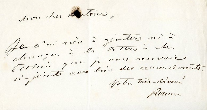 Eigenh. Brief mit U. (?Roenne?). O. O. u. D. ? S. 4to. In französischer Sprache an einen namentlich nicht genannten Adressaten. ? Ludwig von Rönne gehörte seit 1849 dem preußischen Abgeordnetenhaus an, dann auch als Nationalliberaler dem Norddeutschen und dem Deutschen Reichstag. ?Mit seinem Bruder Friedrich Rönne gab er 1832 die Neubearbeitung des ?Systems des Preußischen Landrechts? von Ernst Ferdinand Klein heraus; seit 1843 publizierte er ?Die Verfassung und Verwaltung der preußischen Staaten? (16 Bde.). Sein Hauptwerk war ?Das Staatsrecht der preußischen Monarchie? (2 Bde., 1856?63)? (DBE). ? Mit einem größeren Tintenfleck in der Anrede und kleinen Randläsuren.