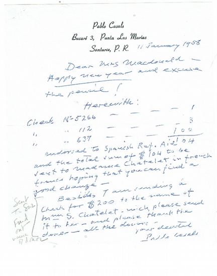 Autograph letter signed. Santurce (Puerto Rico), 11. I. 1958. 8vo. 1 p. Printed letterhead. To Nancy Mac Donald in English: ?Happy new year and excuse the pencil! Herewith: check [?] endorsed to Spanish Ref. Aid and the total sum of $ 104 to be sent to Madame Chatelet in french francs hoping that you can find a good change - Beside I am sending a check for $ 200 to the name of Mme. S. Chatelet - [?] please send it to her - and please thank the donor - all the donors [?]? - From the collection of the pianist Antonio Baciero.