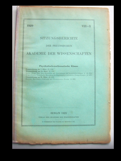 Einheitliche Feldtheorie u. Hamiltonsches Prinzip. Berlin, 1929. 4°. In: Sitzungsberichte der Preuss. AdW, Physikal.-mathemat. Klasse; Gesamtsitzung am 21. März. S. 154-159. OU. Umschl. lichtrandig u. etwas randläd. Rücken überklebt. Unaufgeschn. Seiten des Einstein-Beitrages etwas angeschmutzt u. leicht wasserfl. Weil 166. Boni 184. - = Sitzungsberichte VIII-X. Weiterhin enthalten: Schur, I., Einige Sätze über Primzahlen mit Anwendungen auf Irreduzibilitätsfragen I (S. 125-136) UND: Levi-Civita, T., Vereinfachte Herstellung der Einsteinschen einheitlichen Feldgleichungen (S. 137-153).