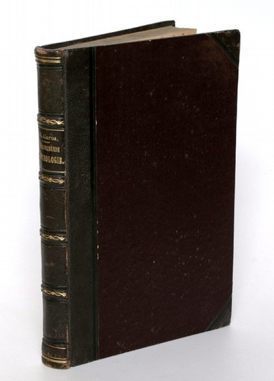 Vergleichende Psychologie oder Geschichte der Seele in der Reihenfolge der Thierwelt. Wien, Braumüller, 1866. VI, (2), 316 SS. Mit einigen Holzstichen im Text. Halblederband der Zeit auf vier Bünden mit goldgepr. Rückentitel und -vergoldung (sign. C. A. Unrasch). Dreiseitiger marmorierter Schnitt. Gr.-8vo. Erste Ausgabe von Carus' letztem wissenschaftlichen Hauptwerk. Mit ganzseitiger eh. Widmung am Vorsatz, ein Geschenk zum 68. Geburtstag des sächsischen Juristen und Historikers Friedrich Albert von Langenn (1798-1868), Präsident des Oberappellationsgerichts Dresden: "Seinem lieben und verehrten Freunde Herrn Präsidenten Dr. v. Langenn Exzellenz zum 26 Januar 1866" sowie 14-zeiligem Gedicht in Hexametern: "Der Du mit sinnigem Blick das Größte wägst und das Kleinste, / Strenge den Schuldigen strafst, doch lieber den Schuldlosen freiläßt! / Auch das Thier ist Dir werth, die ungeflügelte Psyche, / Welchem göttlicher Hauch ersetzt das bewußtvolle Denken; / Dich erfreut seine Regung, zieht an das hohe Geheimnis [...] Endlich löst sich das Siegel, die Binde fällt von den Augen, / Und 'Epheb' am Altar' stellt nun dies Büchlein sich dar". - Der Mediziner Carus (1789-1869), ein Freund Goethes, der auch als Psychologe, Naturwissenschaftler, Philosoph und - unter der Anleitung Caspar David Friedrichs - nicht zuletzt Maler hervortrat, war für die Theorie des Unbewußten im Seelenleben und für die Ausdruckskunde wegweisend. "Carus stellte sich in seinem Buch das Ziel, eine 'Entwicklungsgeschichte der Thierseele vom Infusorium an bis zum menschenähnlichen Affen zu geben, und ein solches Gesammtbild dem gegenüberzustellen, was (er) einestheils in somatischer Beziehung in der vergleichenden Anatomie, anderntheils aber in (der) 'Psyche' als Entwicklungsgeschichte der menschlichen Seele, vom Embryo an bis zur Geistesreife des vollkommenen Menschen, gegeben hatte' [...] In der Darstellung vermochte sich Carus nicht mehr auf das eigentliche Thema zu konzentrieren. In einem Übermaß von Reflexionen schweiften die Gedanken - zweifellos von einer Überfülle des Wissens getragen - vom Gegenstand ab und verloren sich in Abstraktionen" (W. Genschorek, C. G. Carus, 233f.). - Der dekorative Einband vom Buchbinder Unrasch in Dresden, mit dessen Stempel im hinteren Innendeckel. Schönes Dedikationsexemplar des des bedeutenden Frühwerks zur Theorie des Unbewussten. - Mit einigen eh. Notizen und Anstreichungen Langenns im Text bzw. am hinteren Spiegel. - Vgl. Hirsch, I 674. Slg. Borst 2959. Ziegenfuß I, 174.