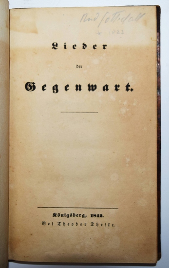 Lieder der Gegenwart. Königsberg, Theodor Theile, 1842. 8°. 116 S., [1] Bl. Halblederband der Zeit mit goldgepr. Rückenschild und dezenter Rückenvergoldung. Holzmann/Bohatta III, 2250. - Erste Ausgabe der ersten Veröffentlichung des Dramatikers, Epikers, Erzählers, Literaturhistoriker und Literaturkritiker R. K. v. Gottschall (1823-1909). - "Rudolf von Gottschall, Sohn eines preußischen Artillerieoffiziers, besuchte die Herzog-Albrechts-Schule (Rastenburg). Nach dem Abitur studierte er ab 1841 an der Albertus-Universität Königsberg Rechtswissenschaft. Dort schloss er sich dem burschenschaftlichen Kränzchen Gothia an. Wegen politischer Agitation relegiert, setzte er sein Studium an der Schlesischen Friedrich-Wilhelms-Universität Breslau fort. 1843 wurde er Mitglied der Alten Breslauer Burschenschaft der Raczeks. Er beendete das Studium an der Friedrich-Wilhelms-Universität zu Berlin. Mit einer Doktorarbeit über die römischen Strafen bei Ehebruch wurde er 1846 in Königsberg promoviert." (Wikipedia). - Rückenschild im Rand mit kl. Fehlstellen, Deckel etwas berieben, Titelblatt gebräunt, gutes Exemplar.