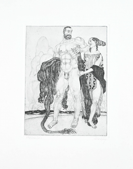 Signierte Original-Radierung. Hercules. wohl Wien, um 1914. circa 20 x 15 cm (nur Bild)., 1 Blatt. verso weiss, mit Rand circa 36,5 x 25,5 cm Muskulöser nackter Mann mit Löwenfell und Keule wird umgarnt von junger Frau - wohl aus der Serie "Tänze". Unten links bezeichnet, rechts signiert. - Nur die Rückseite matt stockig, nicht durchscheinend, vorne sauber und schön.