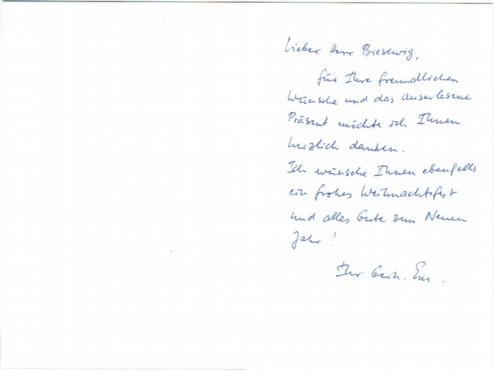 Eigenh. Brief mit eigenh. Unterschrift. ohne Ort und Datum. 8vo. 1 p. Faltkarte. Mit Kuvert. An Dr. Biesewig in Berlin: ?für Ihre freundlichen Wünsche und das auserlesene Präsent möchte ich Ihnen herzlich danken. Ich wünsche Ihnen ebenfalls ein frohes Weihnachtsfest und alles Gute zum Neuen Jahr!?.