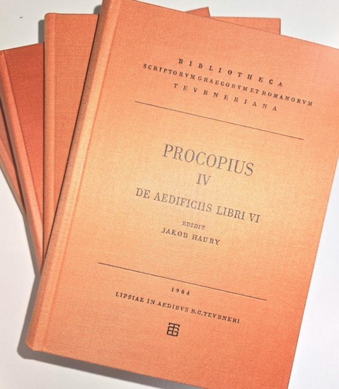 Procopii Caesariensis Opera omnia. Recognovit Jacobus Haury. In 4 Bänden (=komplett). Vol. 1 : De bellis libri I-IV. Vol. II : De bellis libri V-VIII. Vol. III : Historiae quae dicitur arcana. Vol. IV : Peri ktismato? n libri VI, sive De aedificiis cum duobus indicibus praefatione excerptisque Photii adjectis. Editio stereotypa correctior addenda et corrigenda adiecit Gerhard Wirth. B. G. Teubner, Leipzig, 1962-1964. Oktav (205 x 150 mm), Org.-Ganzleinen, LXXXVII (+I), 572 S.; 3 Bll., 699 (+1) S.; XXXIII (+I), 221 (+1) S.; XII, 408 (+2) S., wohlerhaltenes Exemplar. [Bibliotheca Scriptorum graecorum et romanorum Teubneriana.; 1734-1737]. - - [oR-Doki | DOK | ]. [Bibliotheca Scriptorum graecorum et romanorum Teubneriana.; 1734-1737]. - - [oR-Doki | DOK | ].