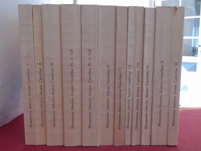 Monumenta Historica Ducatus Carinthiae. Geschichtliche Denkmäler des Herzogthumes (Herzogtums) Kärnten (Bände 1 bis 11 vollständig in 12 Bänden und ein Ergänzungsheft). Band 1: Die Gurker Geschichtsquellen 864-1232; Band 2: Die Gurker Geschichtsquellen 1233-1269; Band 3: Die Kärntner Geschichtsquellen (DKG) 811-1202; Band 4.1: DKG 1202-1262; Band 4.2: DKG 1263-1269; Band 5: DKG 1269-1286; Band 6: DKG 1286-1300; Band 7: DKG 1300-1310; Band 8: DKG 1310-1325; Band 9: DKG 1326-1335; Band 10: DKG 1335-1414; Band 11: DKG 1414-1500; Ergänzungsheft zu Band 1-4. Klagenfurt: Kleinmayr; Verlag des Geschichtsvereins für Kärnten, 1956-1972. Bände 1-4 und Ergänzungsheft = Fotomechanische Nachdrucke 1978 der Ausgaben Klagenfurt, Kleinmayr, 1896-1915. Mit einigen s/w Abbildungen auf Tafeln. Großformat, Original-Broschuren. Bis auf geringfügige Randläsionen und Anschmutzungen an einigen Einbänden gutes Exemplar mit nur leichten Gebrauchsspuren. Textsauber und aus einem Nichtraucherhaushalt. Jeweils mit Namens- und Datumseintrag auf dem Vorsatzblatt.